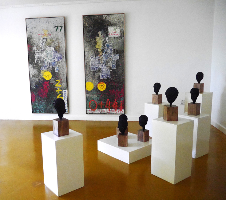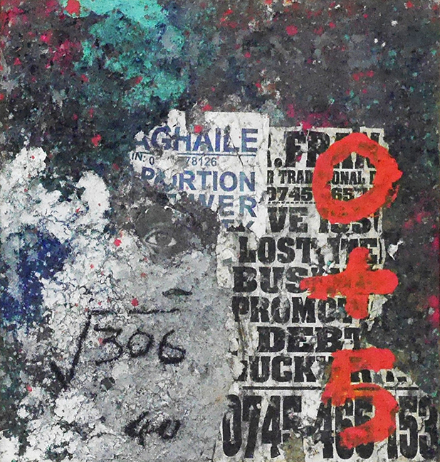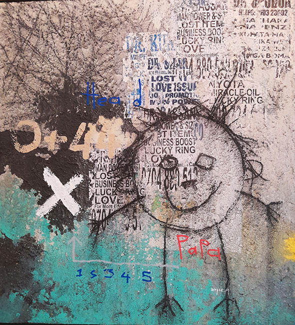 Onyis interprets and transfers these talking walls onto large scale canvases, which are multicolored, semi abstract compositions, commenting in his way on social, political, environmental and societal issue.