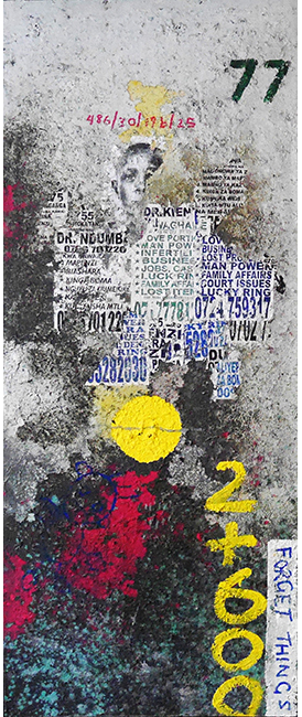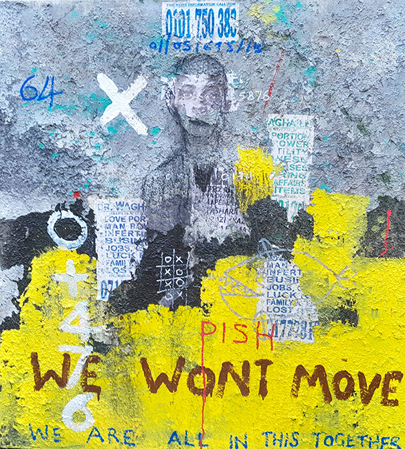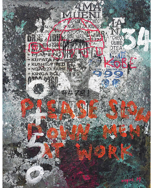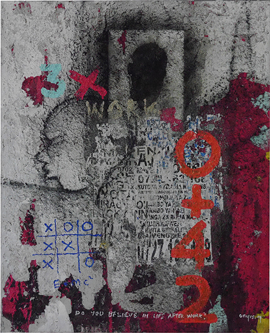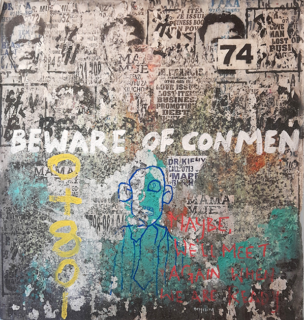 Onyis interprets and transfers these talking walls onto large scale canvases, which are multicolored, semi abstract compositions, commenting in his way on social, political, environmental and societal issue.